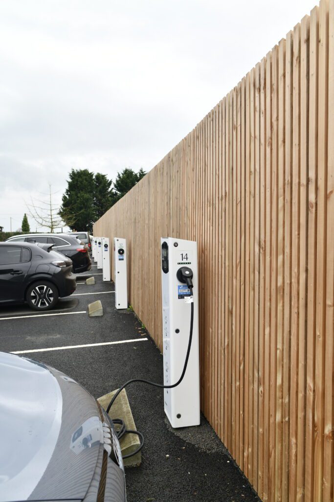Vous avez fait la réservation de votre demi-pension (souper, nuitée, petit-déjeuner) et votre borne de rechargement pour véhicule électrique en mentionnant que vous êtes un lecteur de la VIA ELEKTRA©. Ici vous allez trouver pas moins de 15 bornes installées le long de la palissade qui borde la soucoupe-volante- restaurant. Ces bornes de recharge sont réservées aux clients.