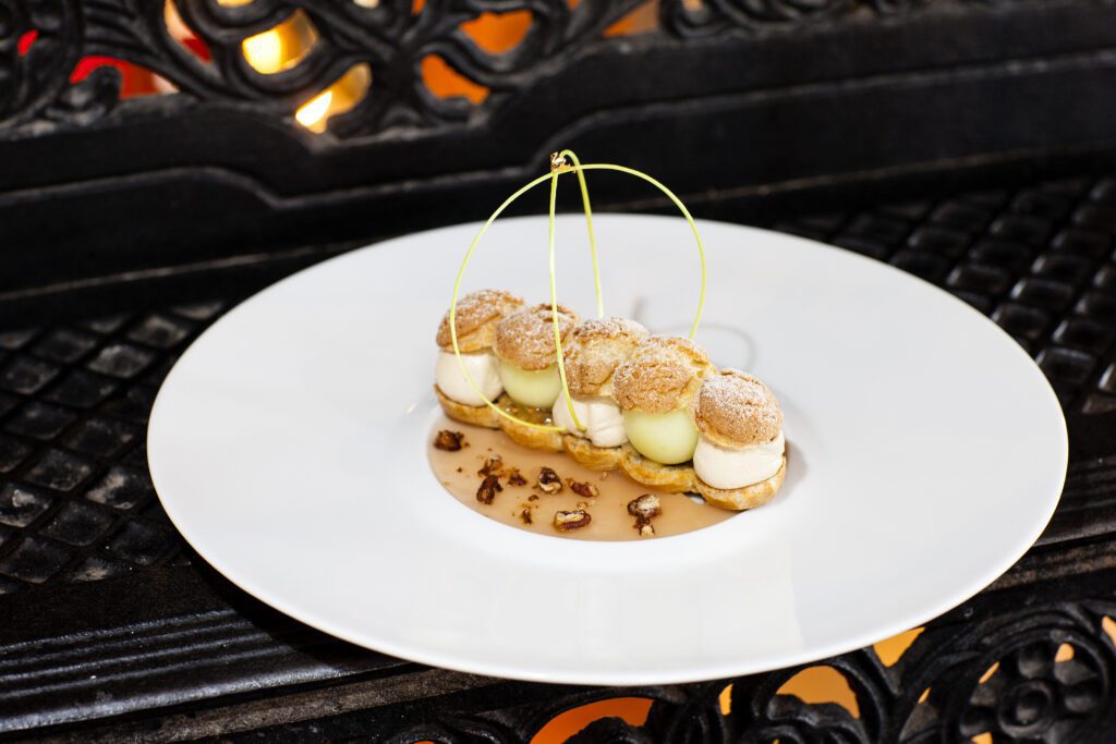 Yves-Marie Rolland associe un praliné aux noix de pécan, avec une crème mousseline à l’érable, une brunoise aux pommes déglacées au cidre de glace, une gelée à la pomme, des noix de pécan caramélisées, un sorbet à la pomme verte, de sablés bretons et d’une feuille d’or. Une authentique œuvre d’art célébrant le lien inoxydable entre la France et la Nouvelle-France.