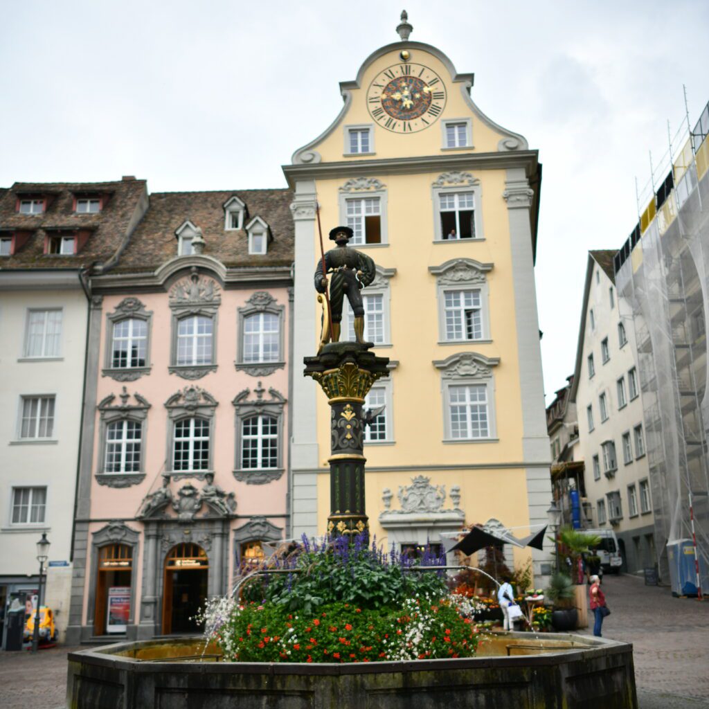 Chaque place du centre piétonnier est ornée d’une fontaine dominée par une statue polychrome. On y trouve facilement quelques bornes de rechargement pour faire l’appoint avant de repartir en direction de Saint Gall soit en longeant la rive sud du lac du Constance, soit en prenant l’autoroute 4 puis 1. (Ne pas oublier d’acheter votre vignette). La route vers Saint Gall est aisée. Elle longue la partie sud du bassin du lac de Constance sur environ 80 km.