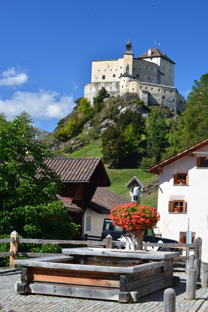 entouré par une couronne de sapins elle-même cernée de pâturages verdoyants. L’histoire de ce château remonte à la fin du 11e siècle. Ce qui était hier un manoir appartenant à la famille des Taraspins est aujourd’hui un nid d’aigle qui garde l’entrée de la vallée de Scuol