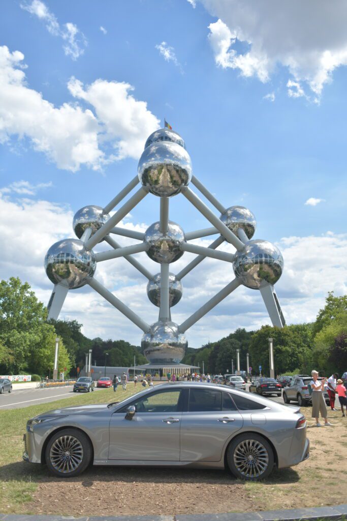 Après avoir fait le tour ouest de Bruxelles, nous allons photographier la Toyota Miraï au pied de l’Atomium.