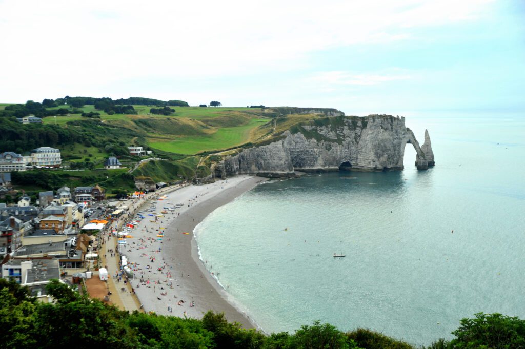 La journée est bien avancée, donc allons à l’essentiel. Vous devez monter au sommet de la falaise d’Aval. Son arche, célèbre à travers le monde, a été sculptée par la mer. Depuis son sommet, à 75 mètres de haut, la falaise d’Aval ouvre un panorama splendide sur le village d’Étretat.